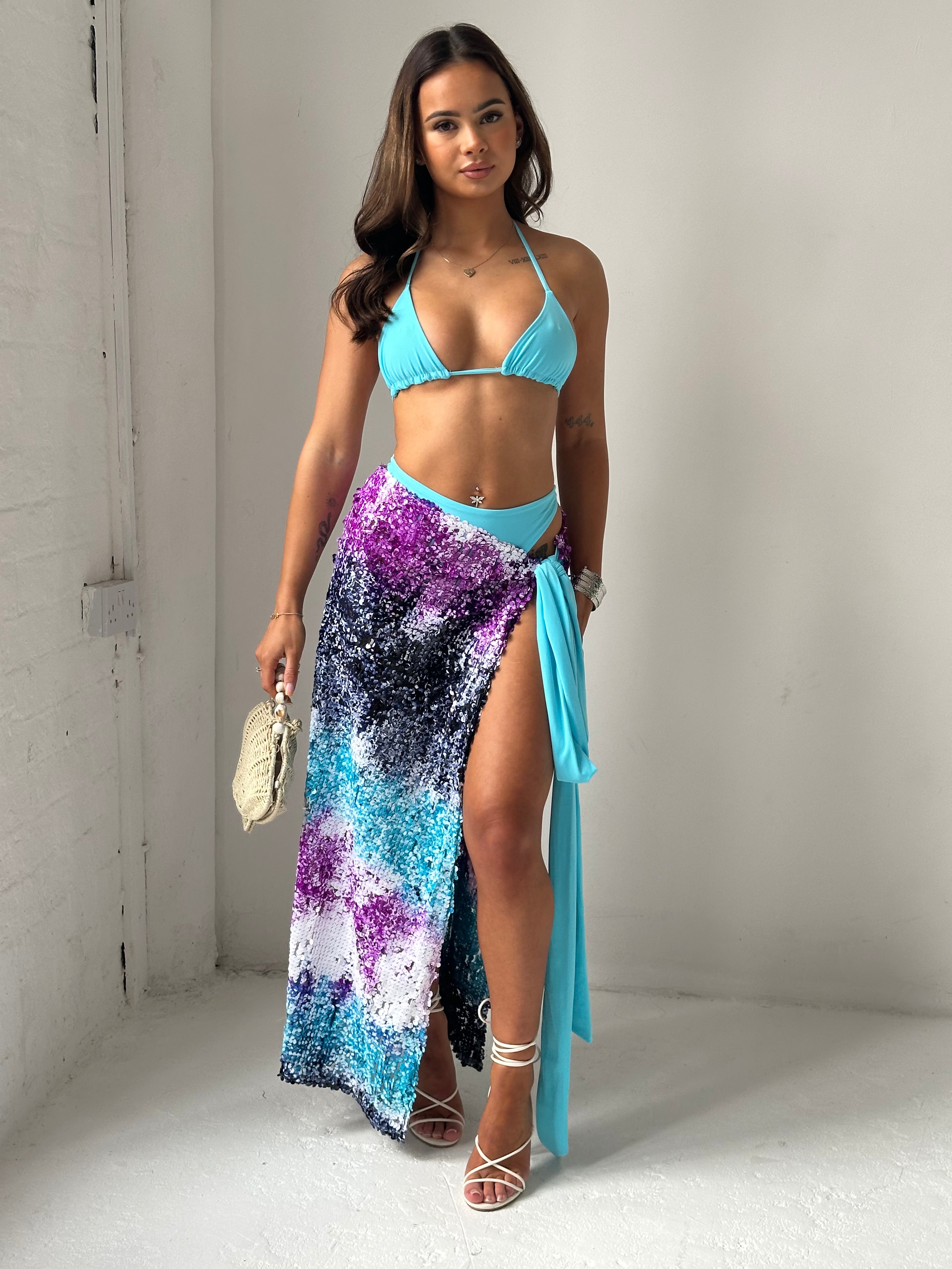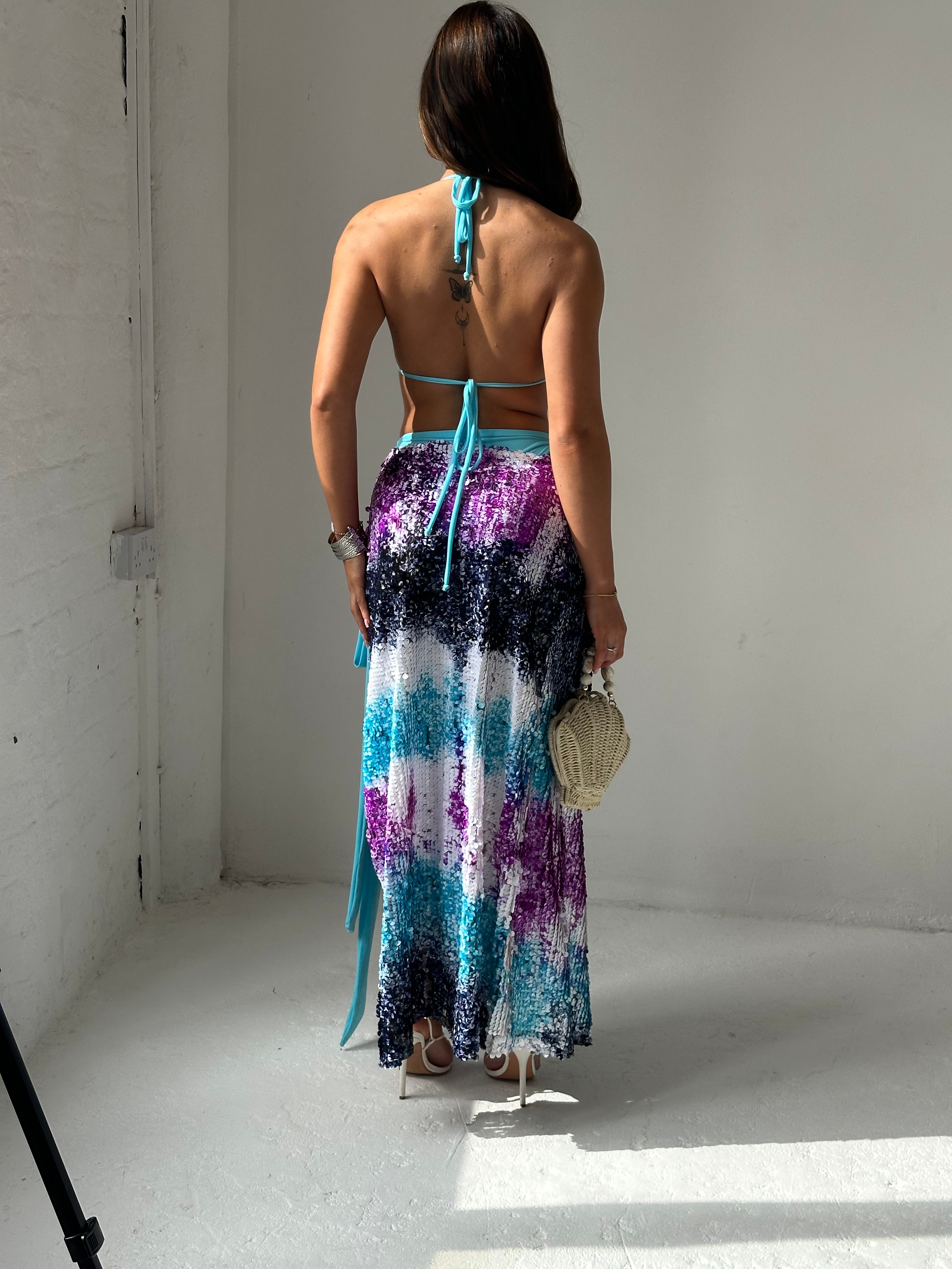 Stripe sequin maxi skirt - undergarments NOT included. Handwash only. Do not tumble dry. The model wears a UK 6. If you do not want it to sit so low waisted, we would recommend sizing down.