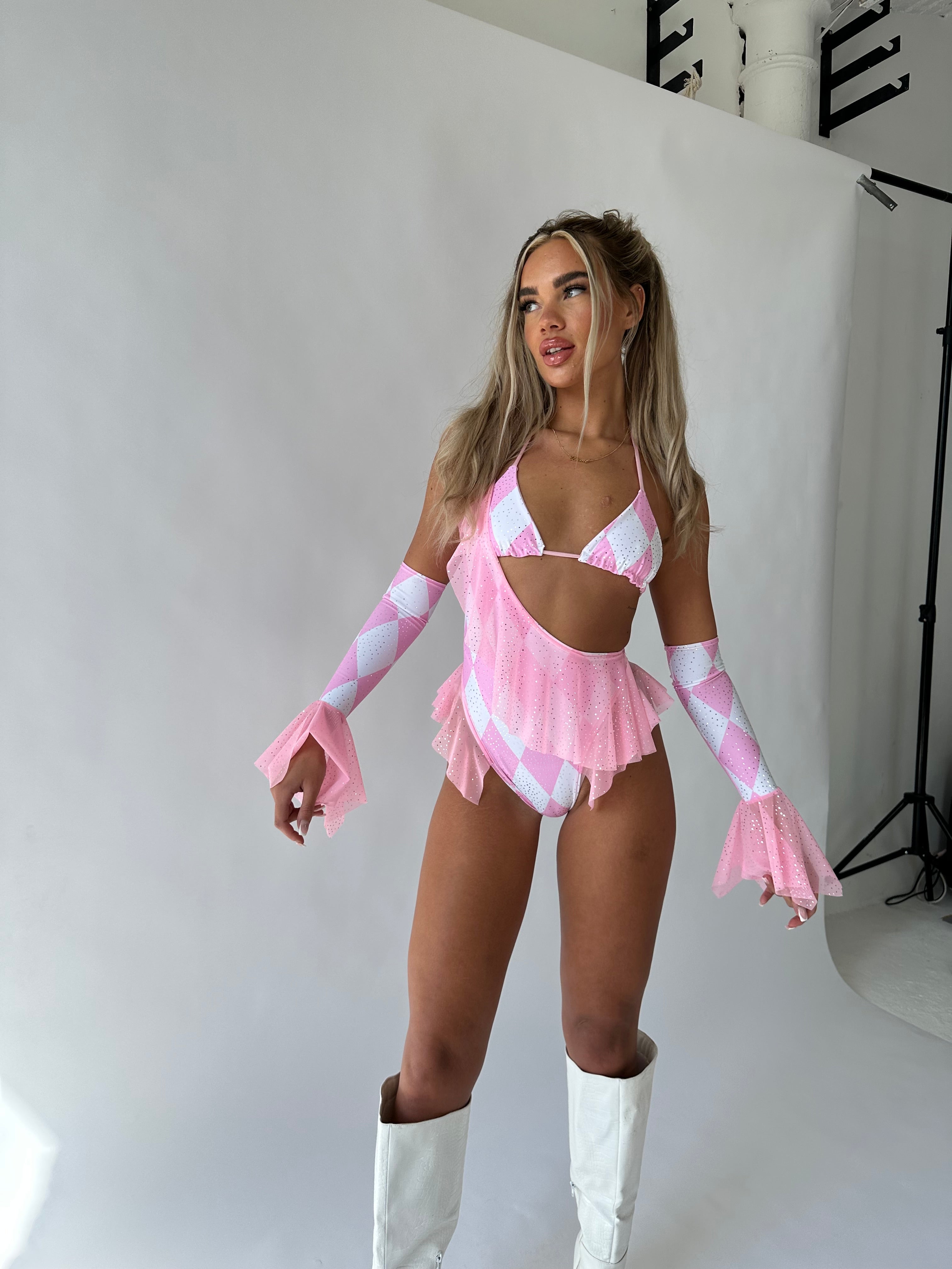Pink and white circus print one-shoulder bodysuit with pink twinkle mesh frills around both hips and on the front of the bodysuit. Also has a matching triangle top in the same print. Frill sleeves are optional.