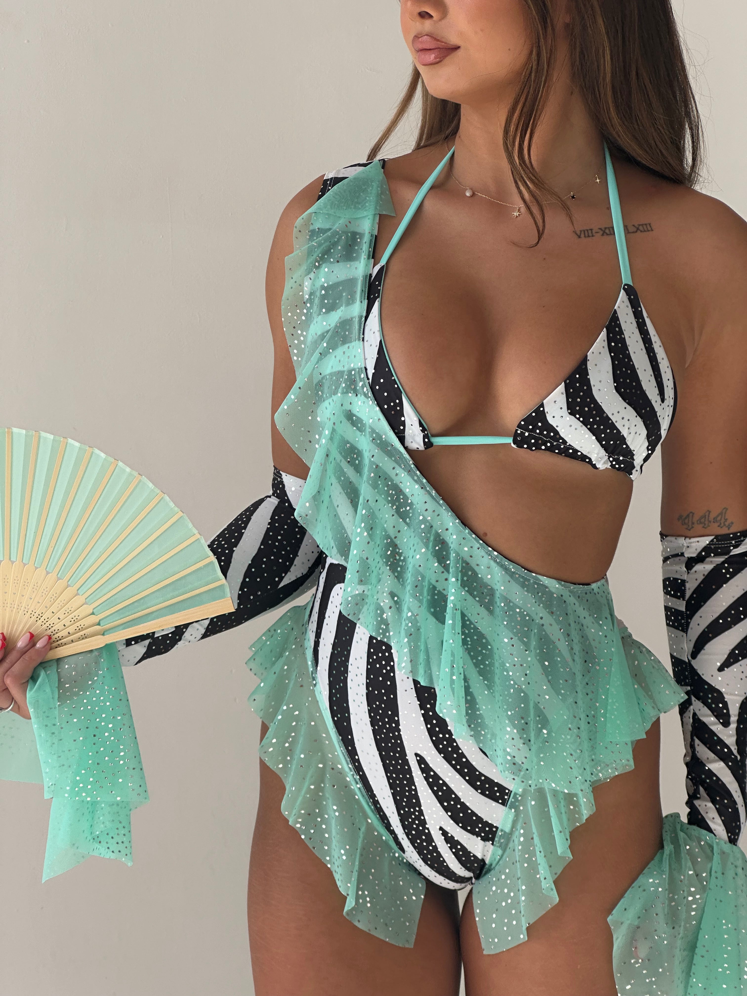 Black and white zebra print one-shoulder bodysuit with twinkle mesh frills around both hips and on the front of the bodysuit. Also has a matching triangle top in the same print. Frill sleeves are optional.