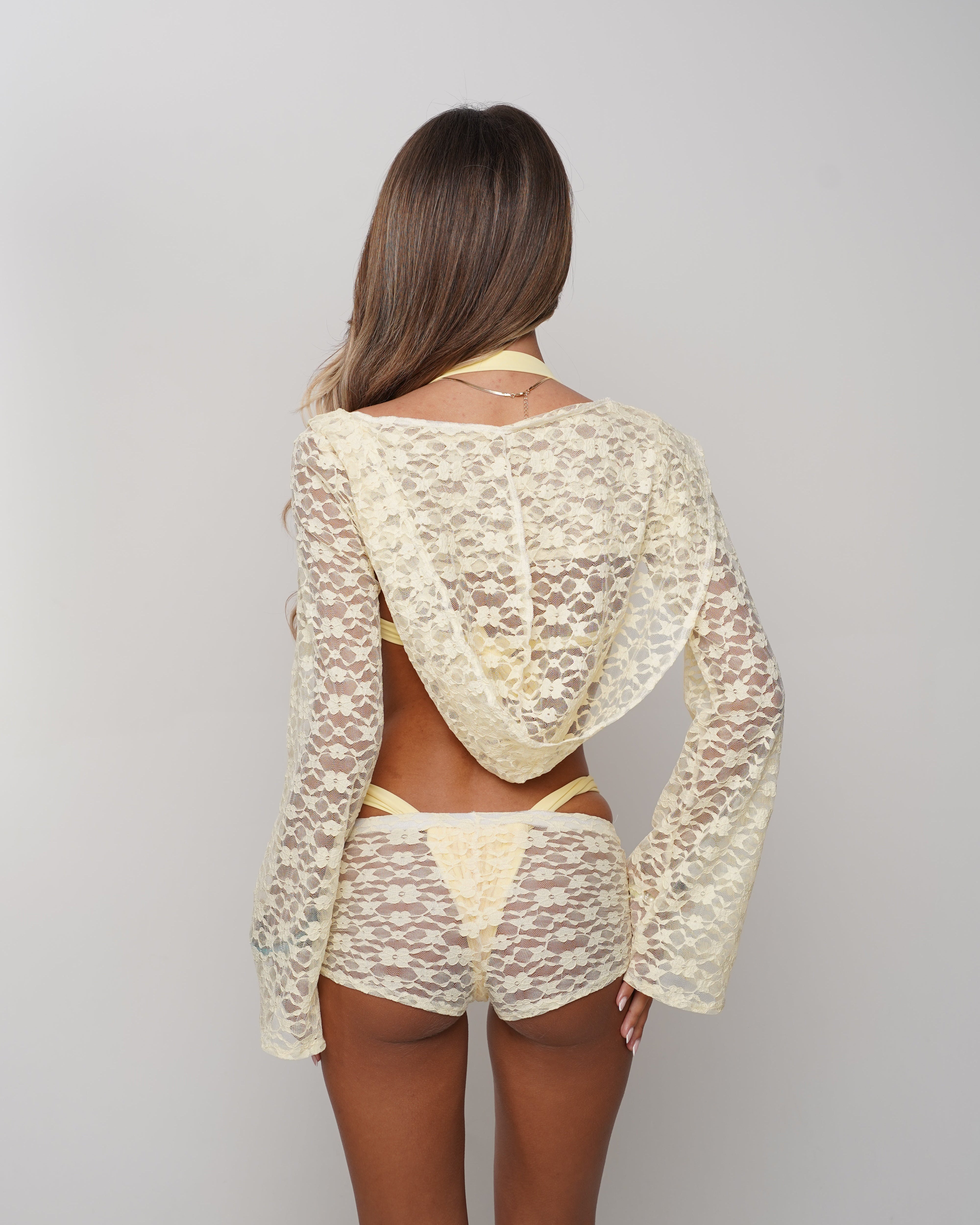 Lace shrug in a gorgeous buttercream yellow. Shrug pictured is with the hood but this is optional.