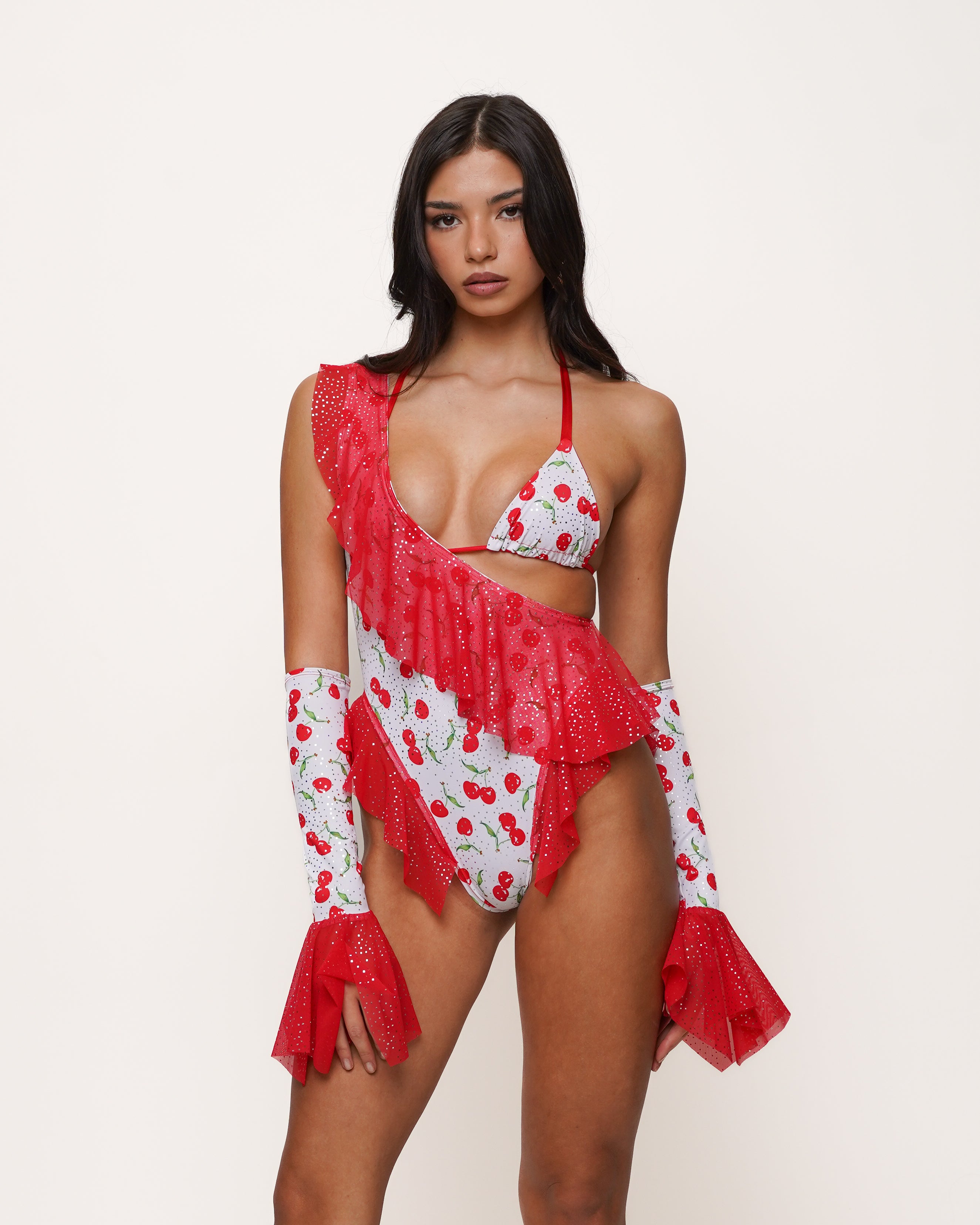 Cherry twinkle print one-shoulder bodysuit with red twinkle mesh frills around both hips and on the front of the bodysuit. Also has a matching triangle top in the same print. Frill sleeves are optional.
