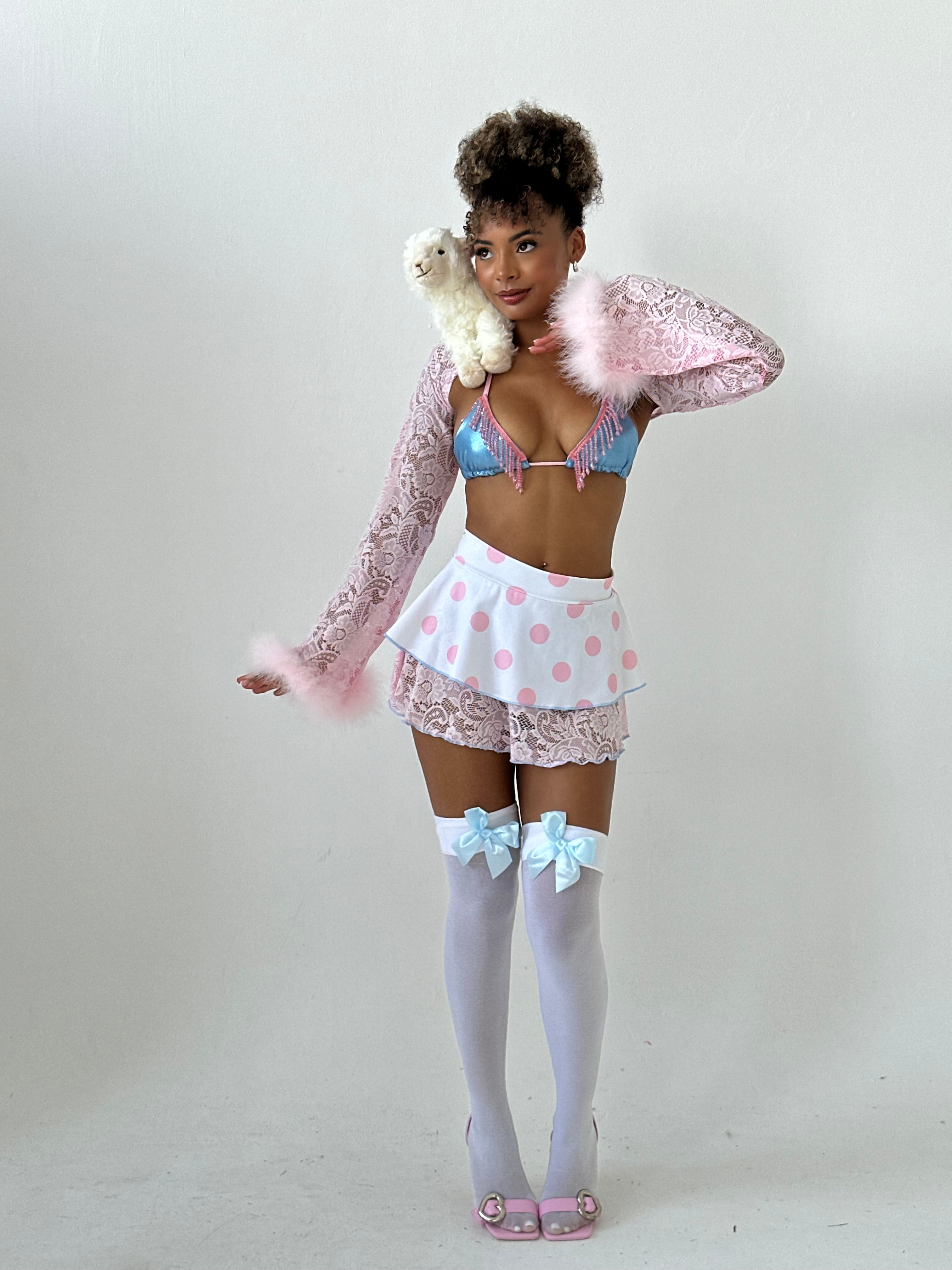 This set features a baby pink lace shrug with pink fluff on the sleeves, a light blue metallic triangle top with pink crystal beading and a pink polka dot / pink lace skort with blue rolled hem.
