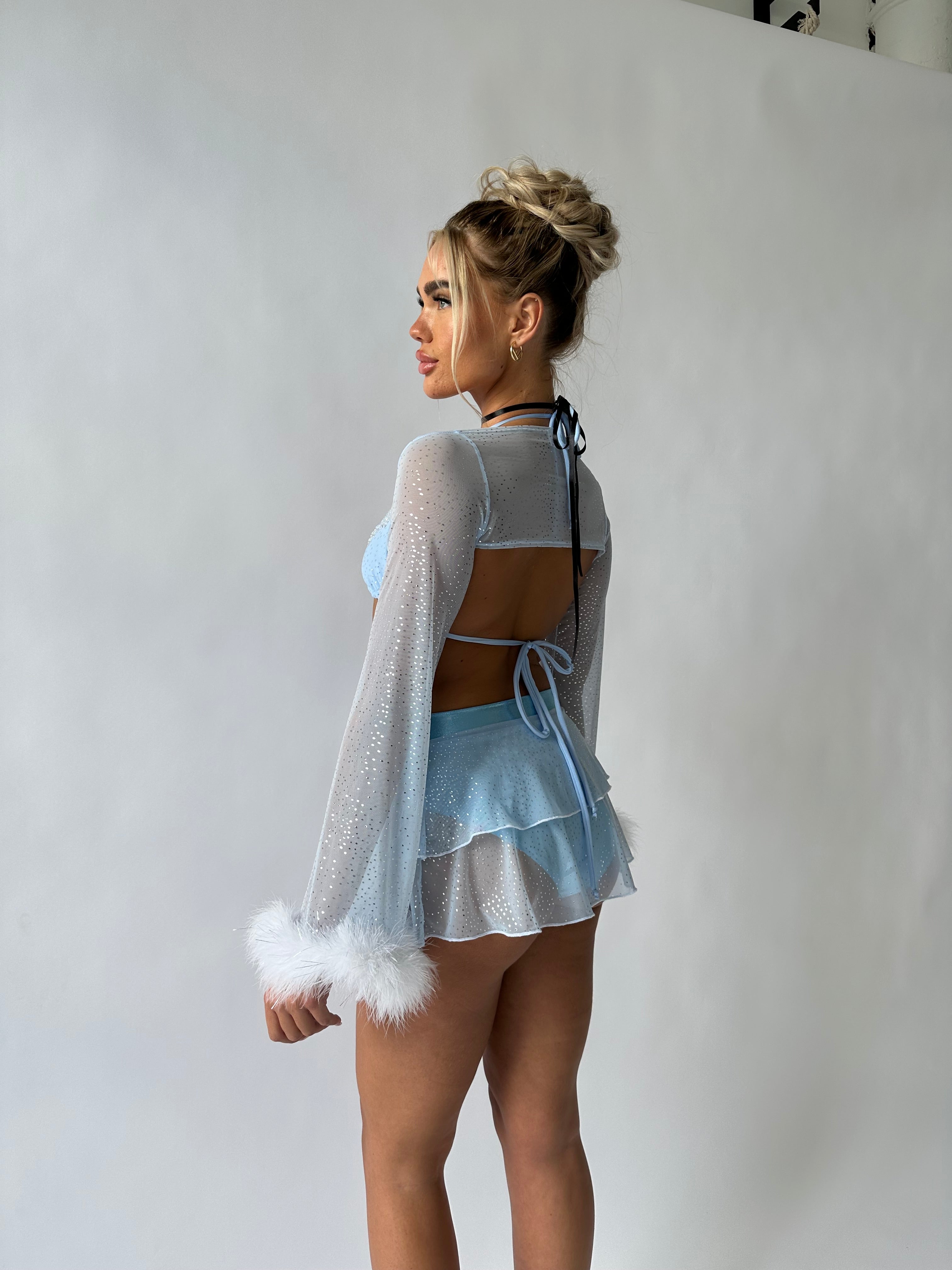 Baby blue twinkle lined top with crystal beaded trim along one of the sides.