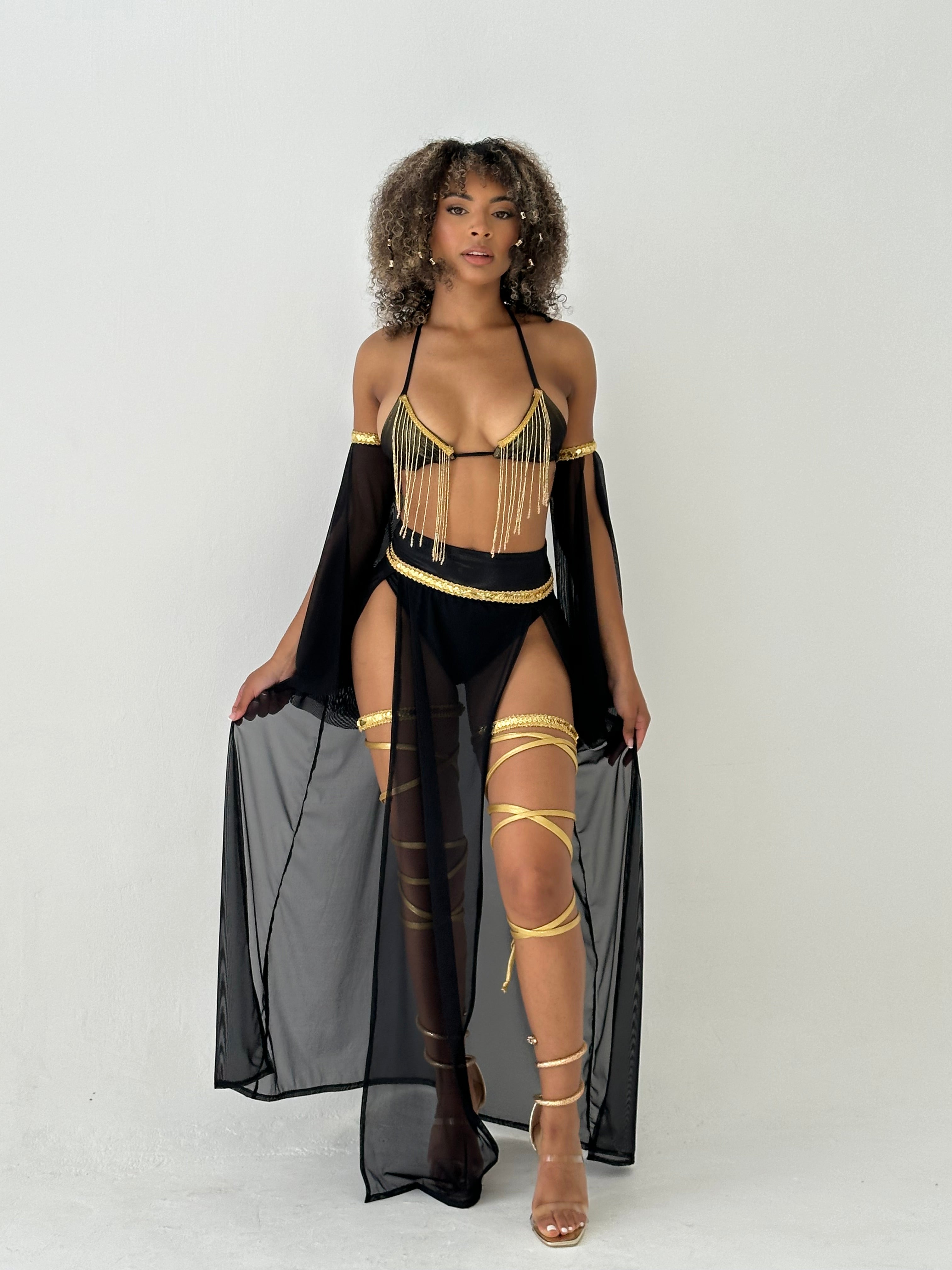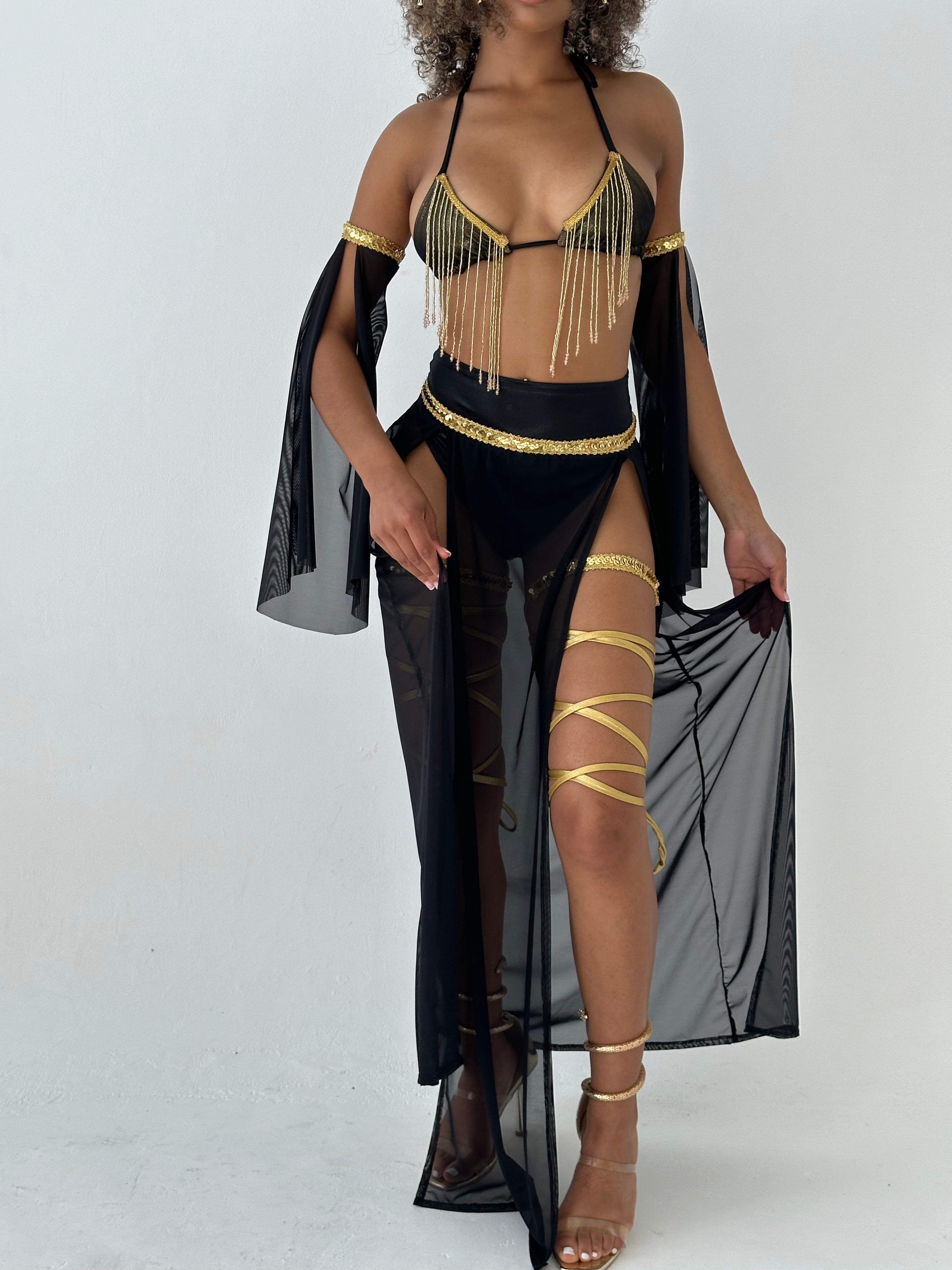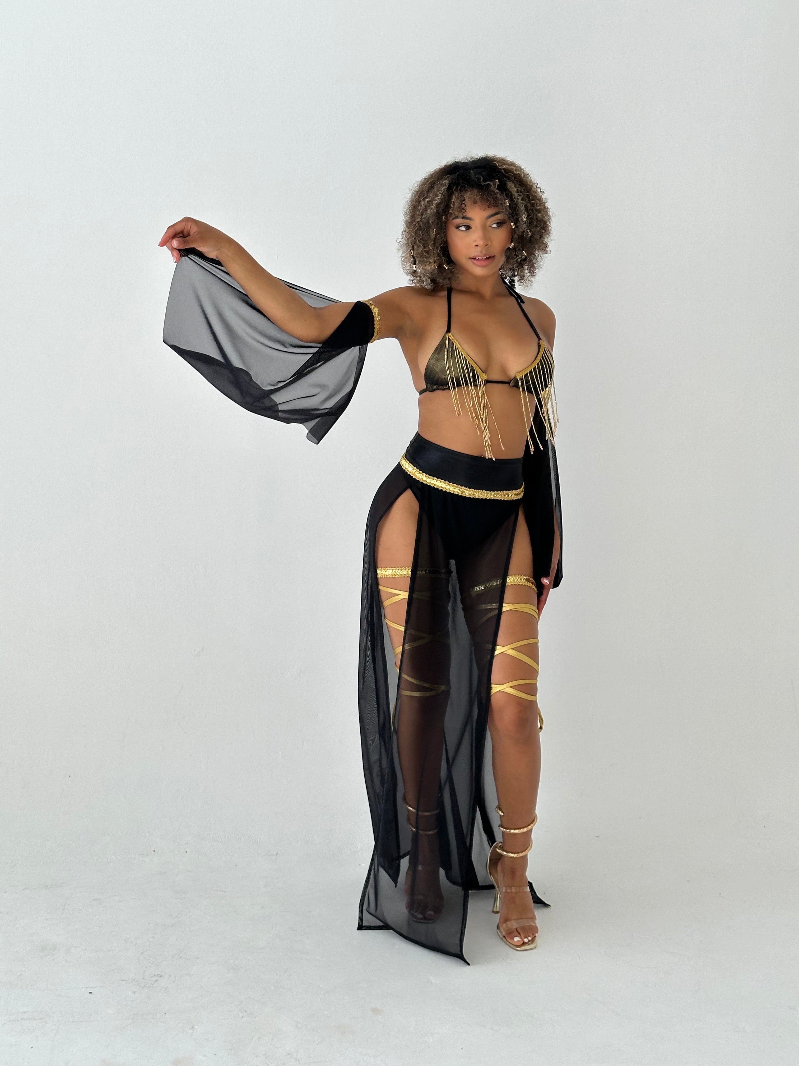 This set features a gold crystal beaded top on a black shine mesh fabric (top is not see though), black mesh flowy sleeves, black mesh flowy skirt with slits, metallic black bottoms and gold sequin leg ties.