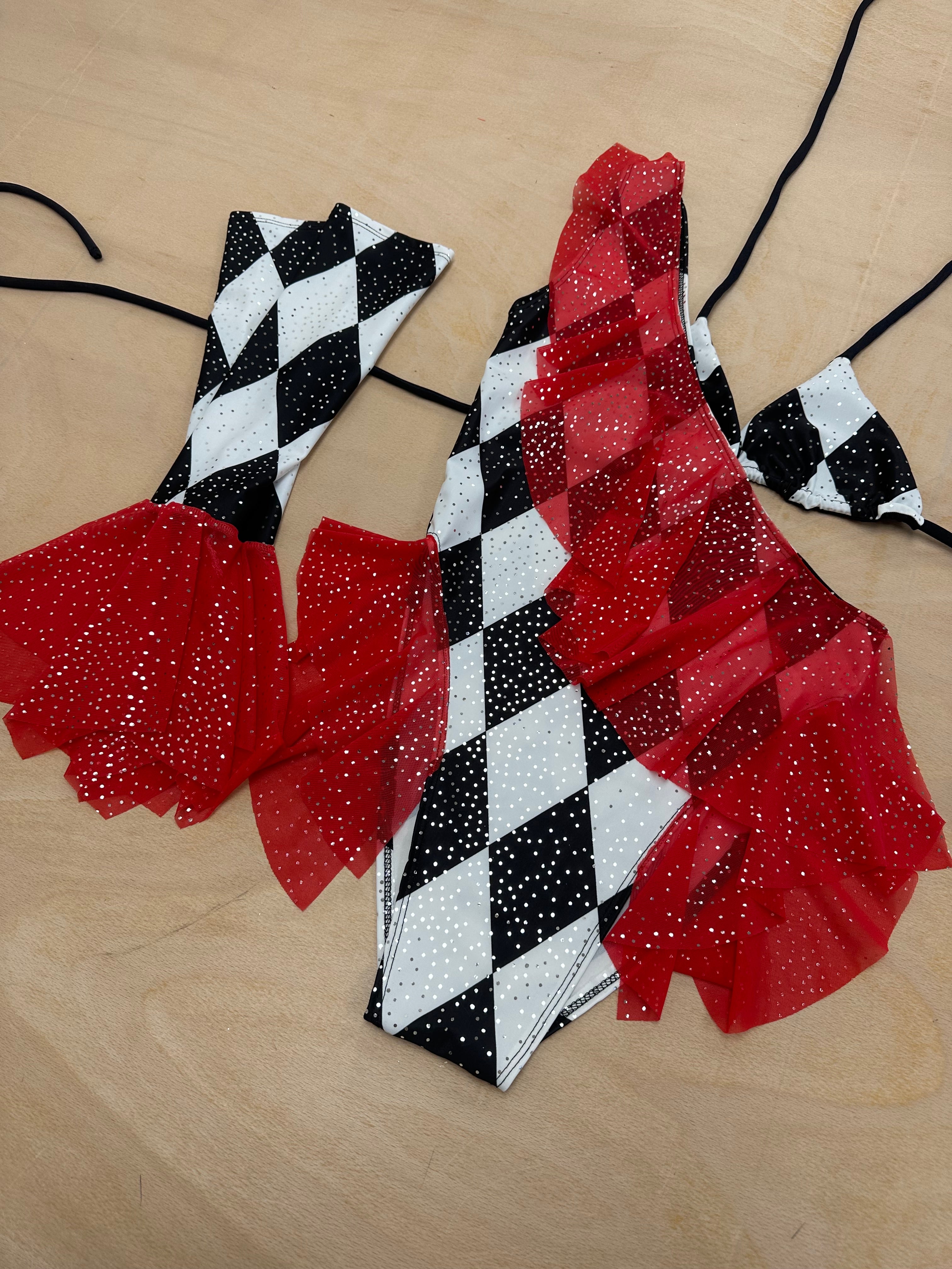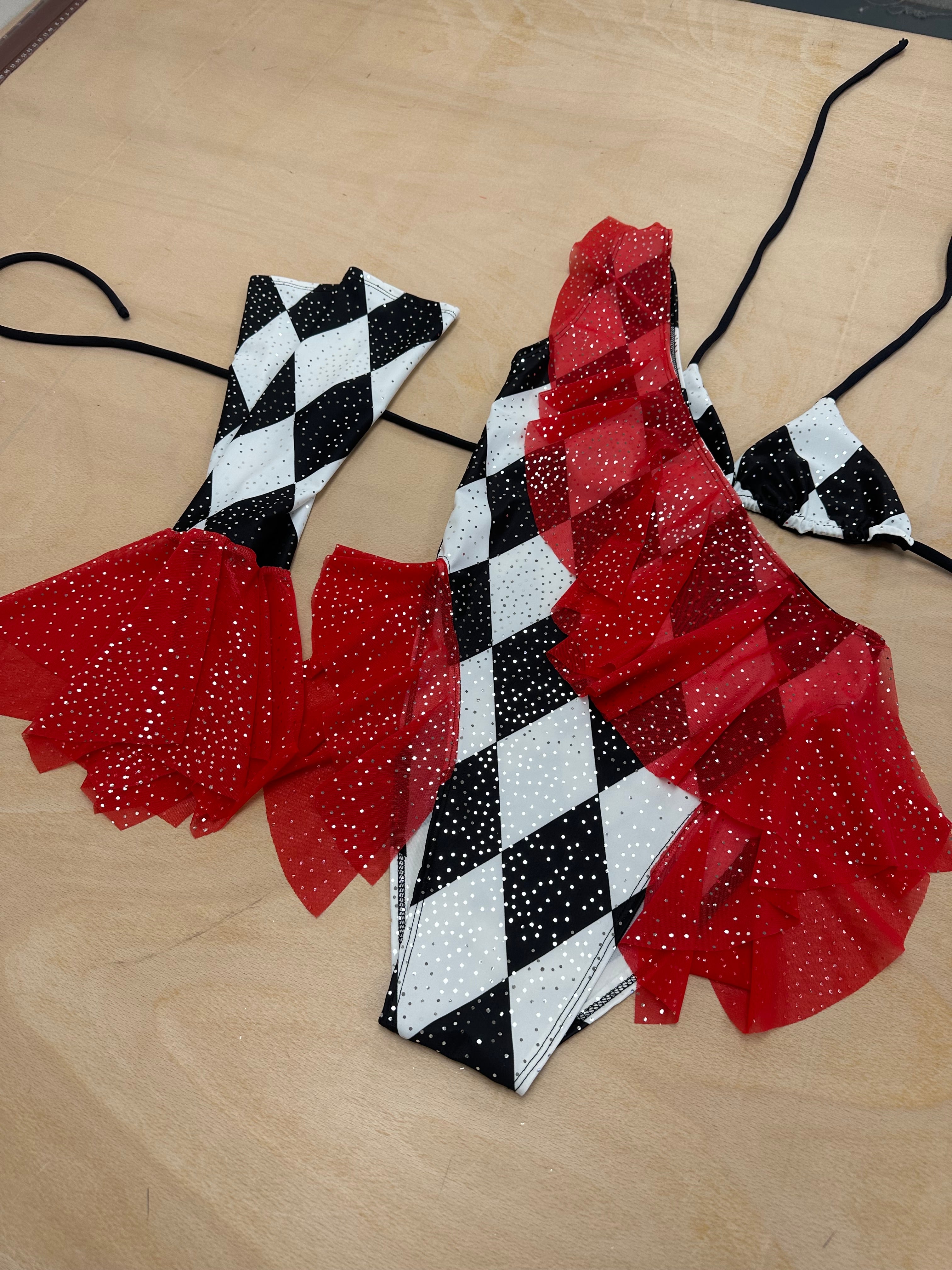 Black and white circus print one-shoulder bodysuit with red twinkle mesh frills around both hips and on the front of the bodysuit. Also has a matching triangle top in the same print. Frill sleeves are optional.