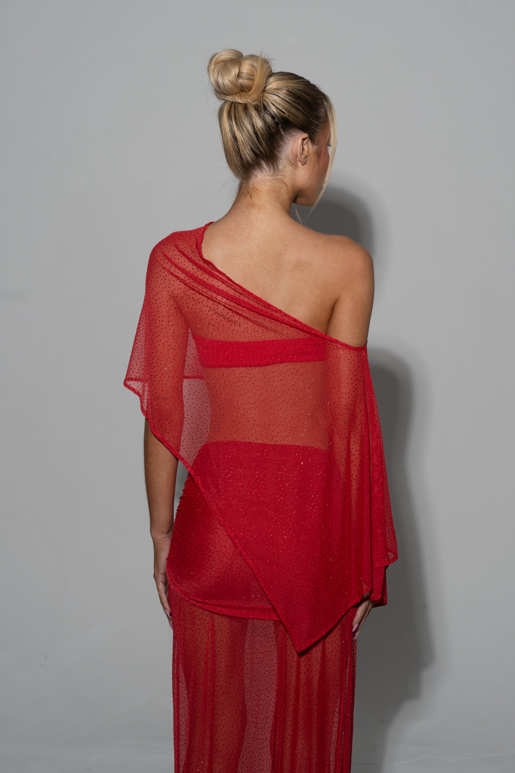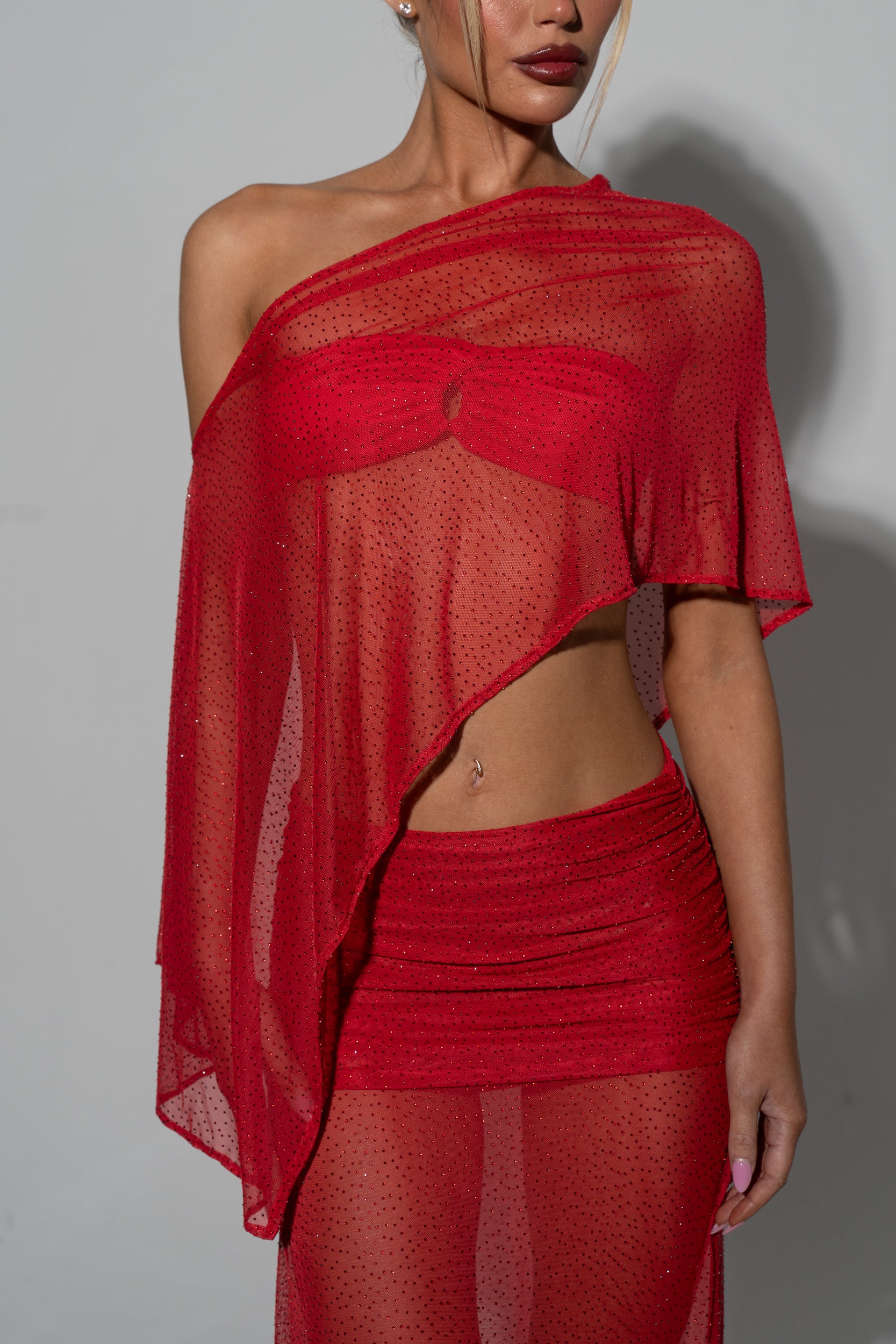 - Sheer red mesh with studded detail