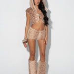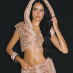 Sweet meets statement - a cropped hooded faux fur top with front clasp closure, perfect layered or styled solo.