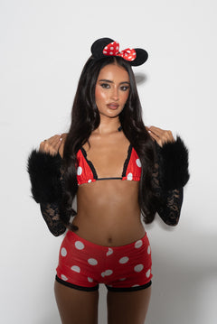 Sultry meets playful. This cropped black lace shrug is finished with faux fur cuffs for a bold edge. Layer it over the Minnie top + shorts for a full Halloween look.