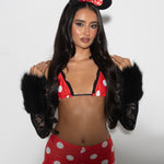 Classic Minnie energy with a grown-up twist. This red polka dot triangle top features delicate black lace trim and adjustable halter + back ties for the perfect fit.