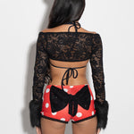 Polka dots, but make it hot. These cheeky red shorts are trimmed with lace and finished with a statement black lace bow at the back. Don't want the bow? You're in luck - she's completely optional.