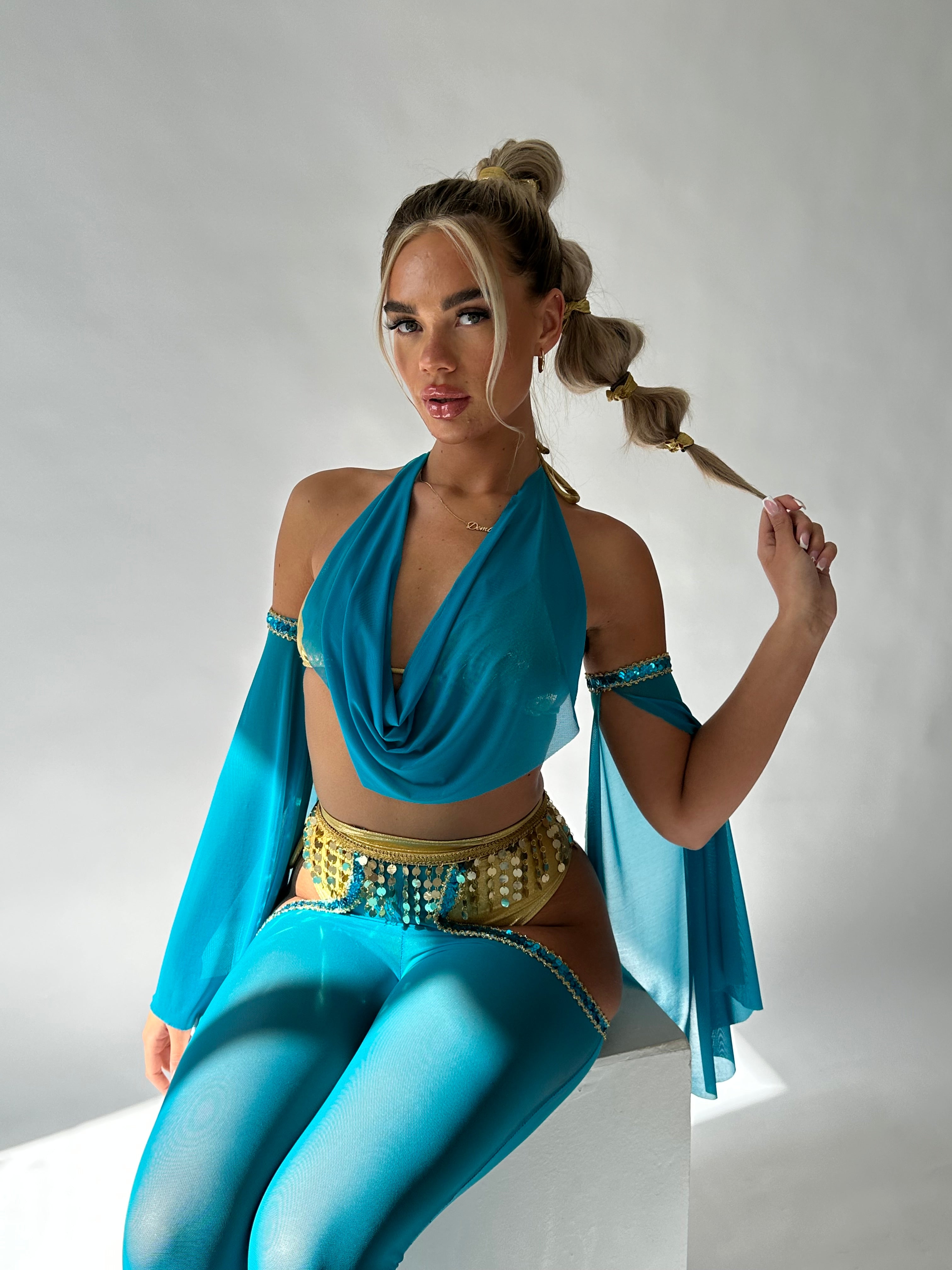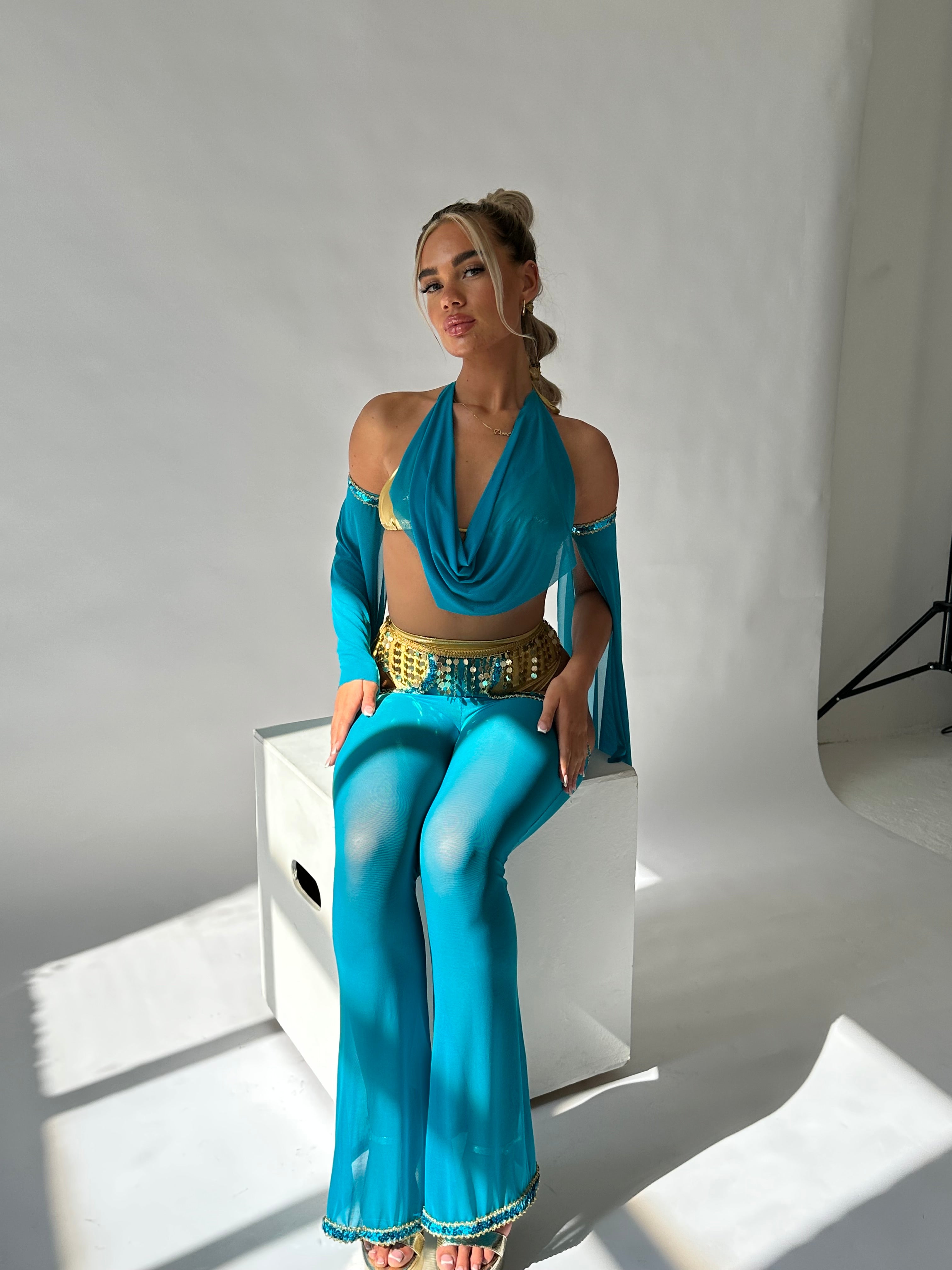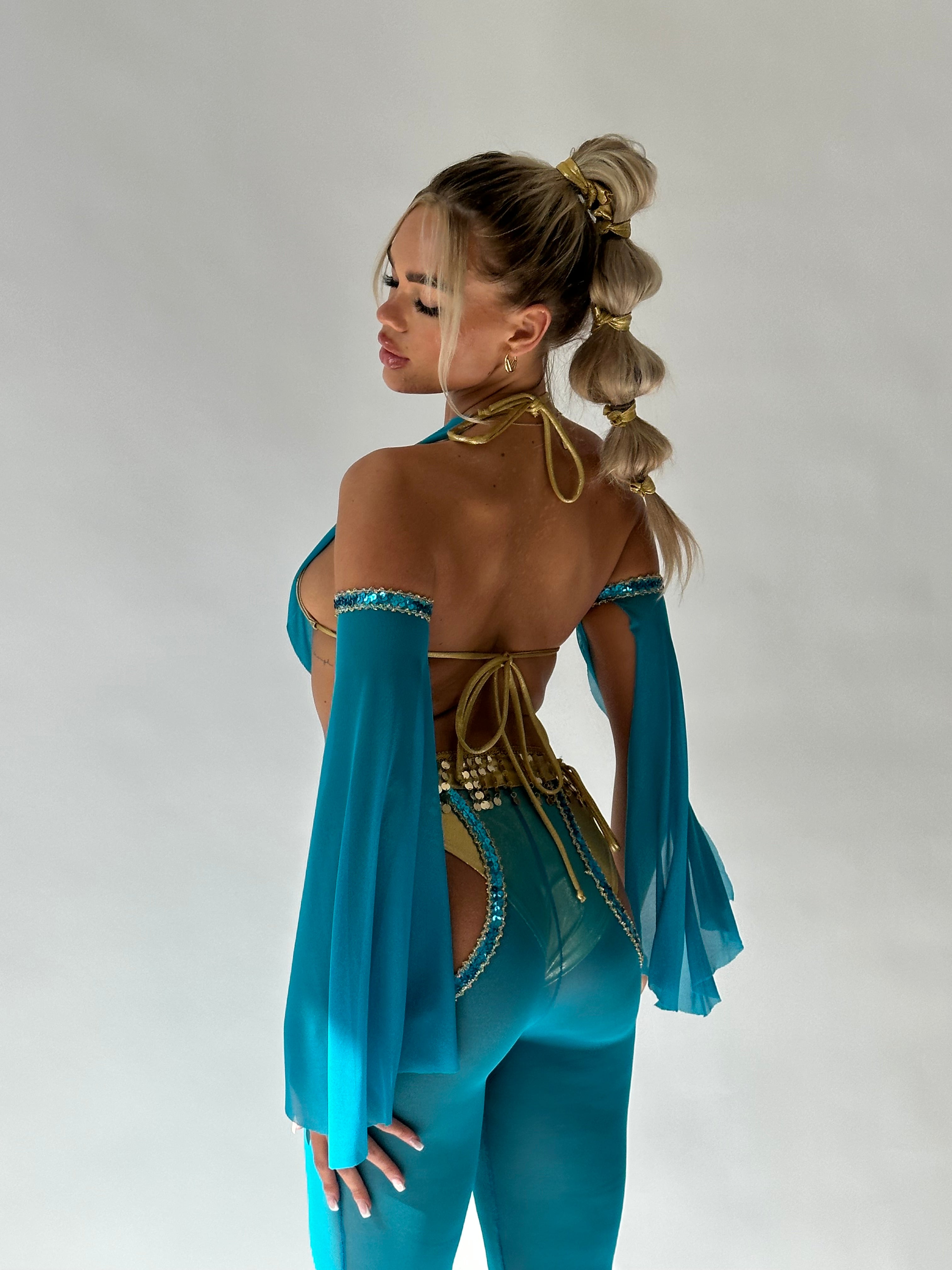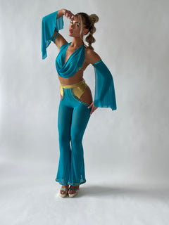 Metallic gold triangle top with a teal mesh drape to give it a cowl neck look.