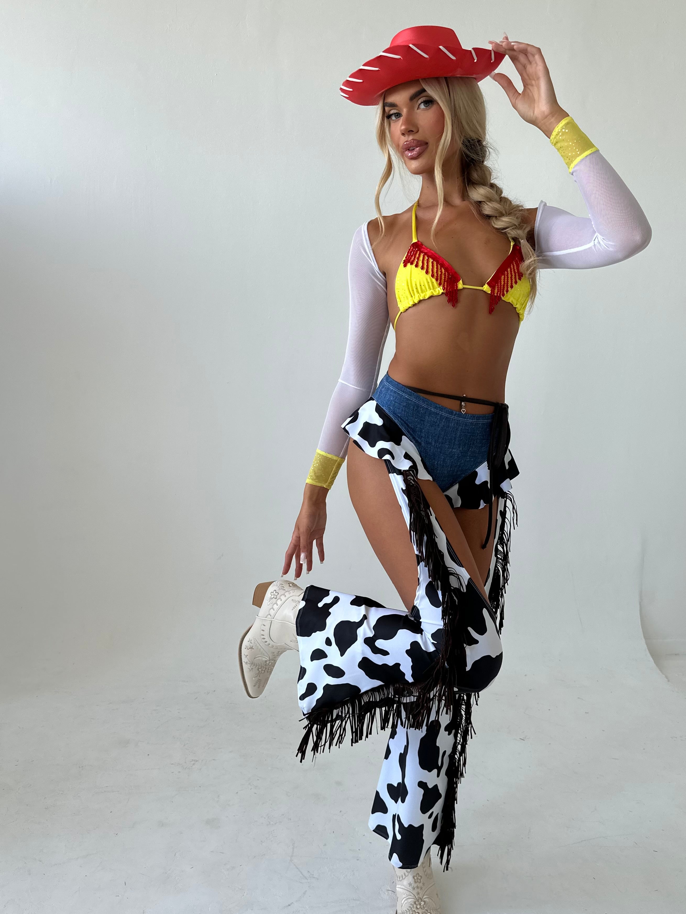 Denim print lycra bottoms with cow print frills around the leg seams and cow print chaps with brown faux suede fringing down the sides of the legs.