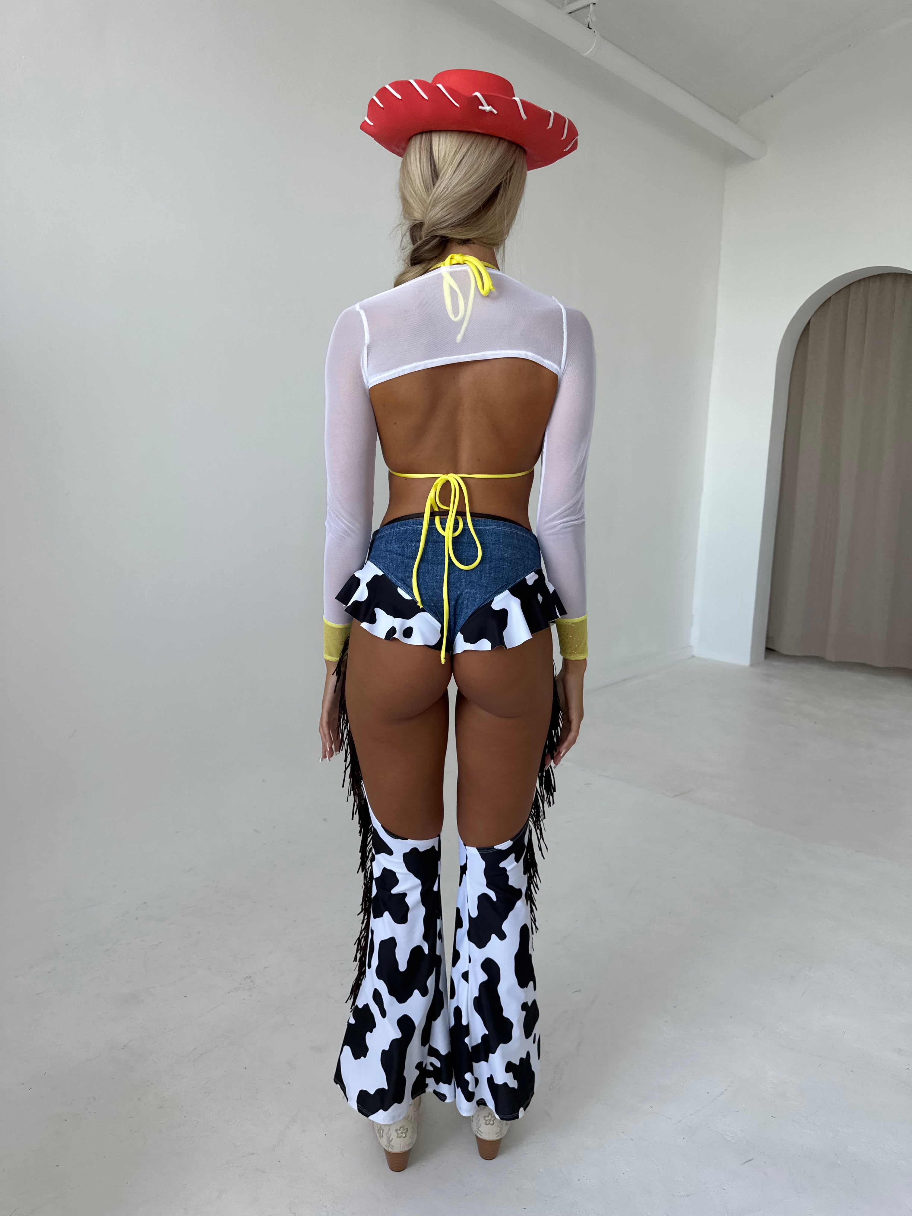 Pieces included: yellow twinkle triangle top with red beads, white mesh shrug with yellow twinkle cuffs, denim print lycra bottoms with cow print frills on the leg seams and cow print lycra chaps with faux suede fringing down the sides. PLEASE WRITE YOUR INSEAM LENGTH IN THE NOTES AS WE WILL NOT BE ABLE TO MAKE + SHIP OTHERWISE