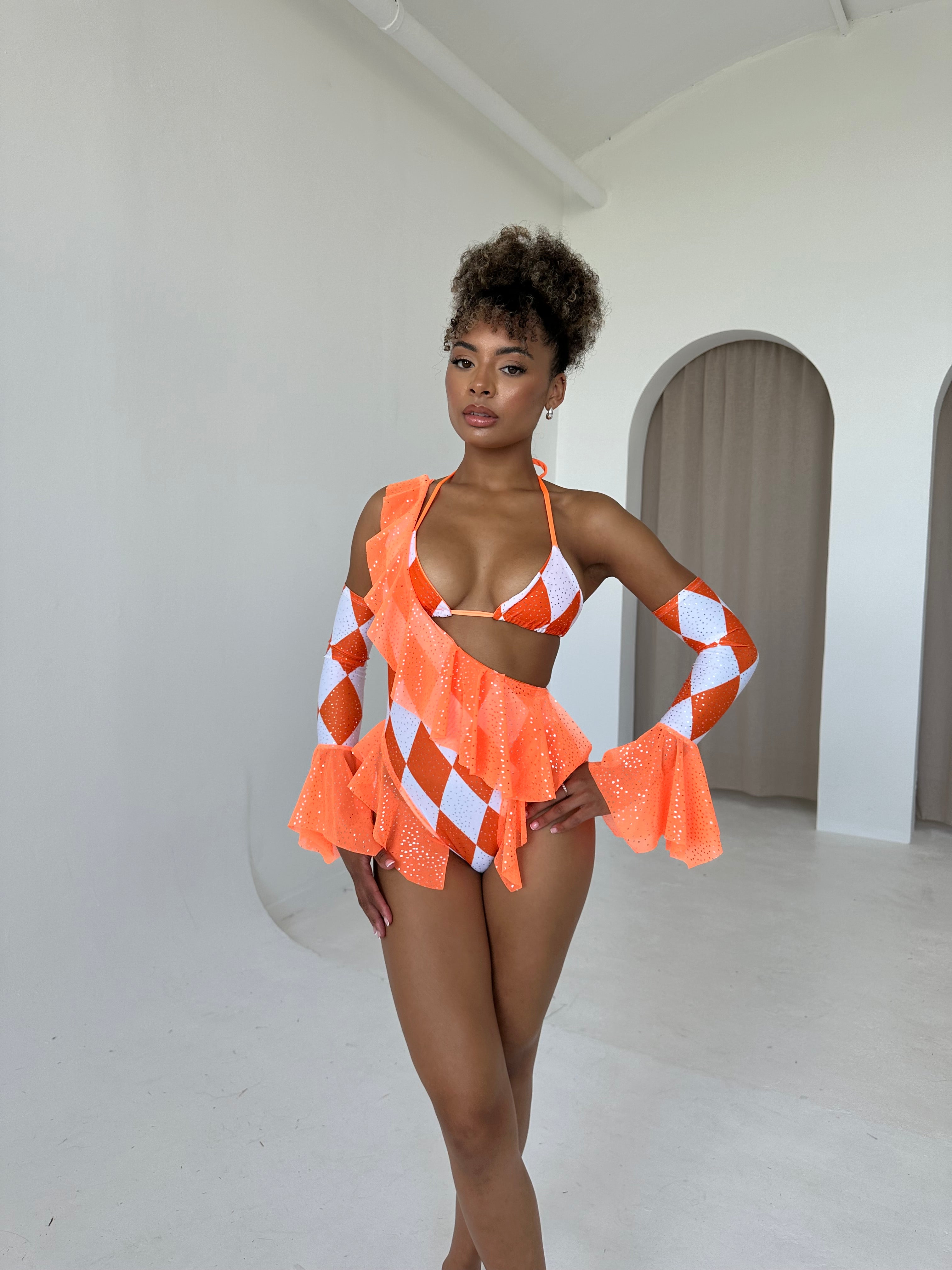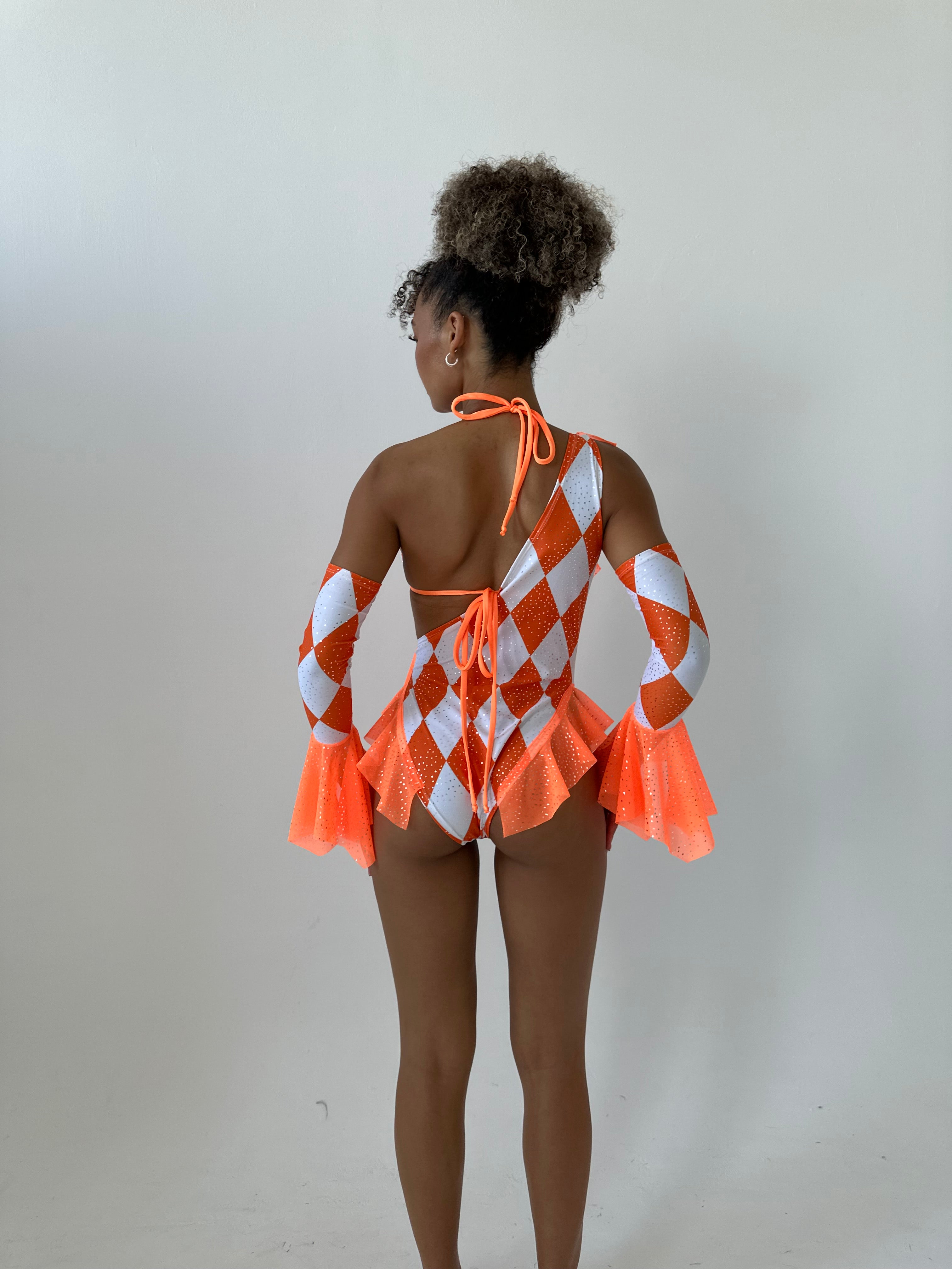 Orange and white circus print one-shoulder bodysuit with orange twinkle mesh frills around both hips and on the front of the bodysuit. Also has a matching triangle top in the same print. Frill sleeves are optional.