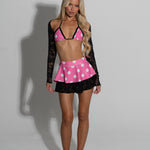 Sweet but cheeky 🍭 This pink polka dot skort features a flippy mini skirt with lace underlay bottoms for comfort and coverage. Finished with a playful fit-and-flare shape, it’s giving girly Minnie energy.