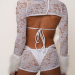 White lace shrug with tight sleeves and luxury faux fur cuffs.