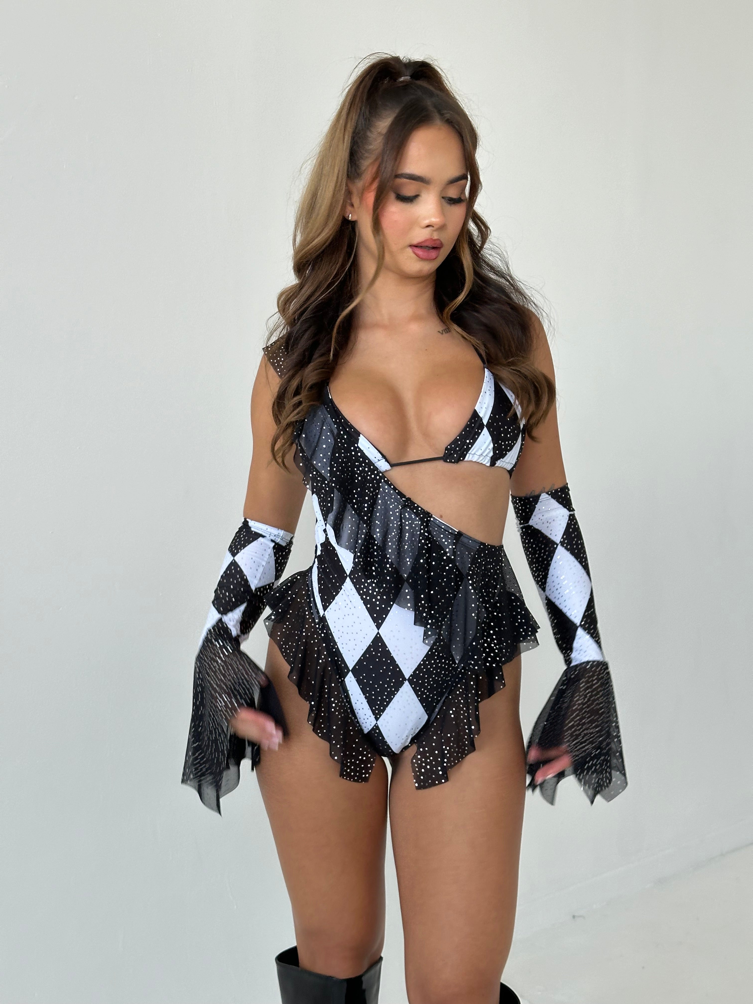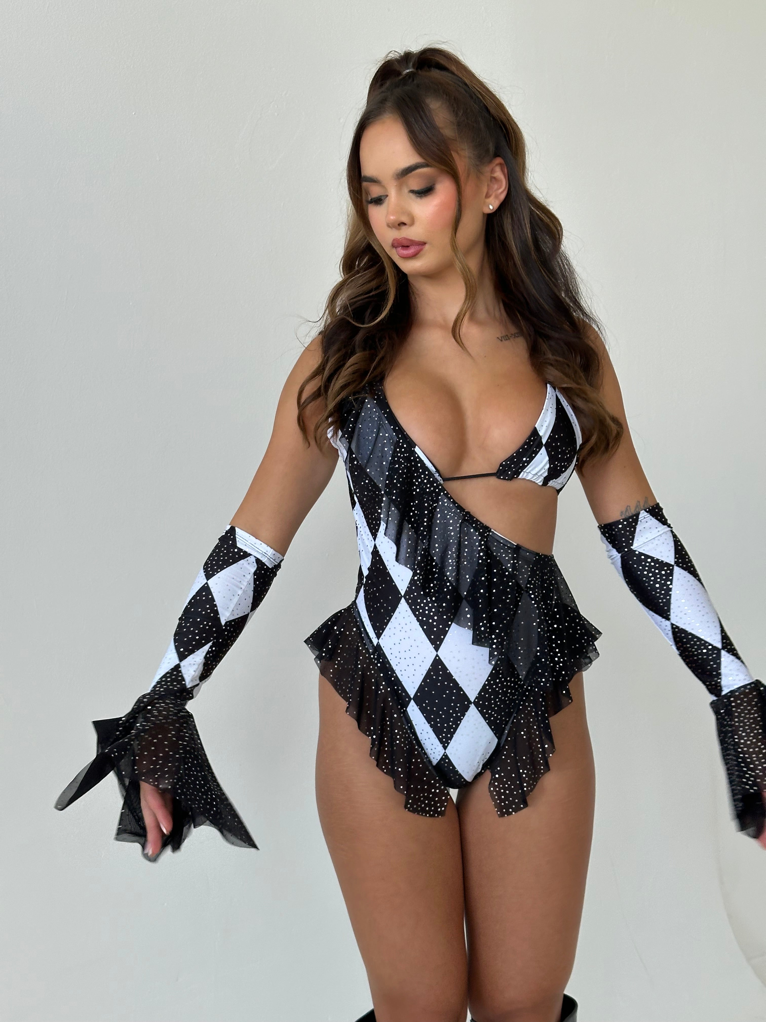Black and white circus print one-shoulder bodysuit with black twinkle mesh frills around both hips and on the front of the bodysuit. Also has a matching triangle top in the same print. Frill sleeves are optional.