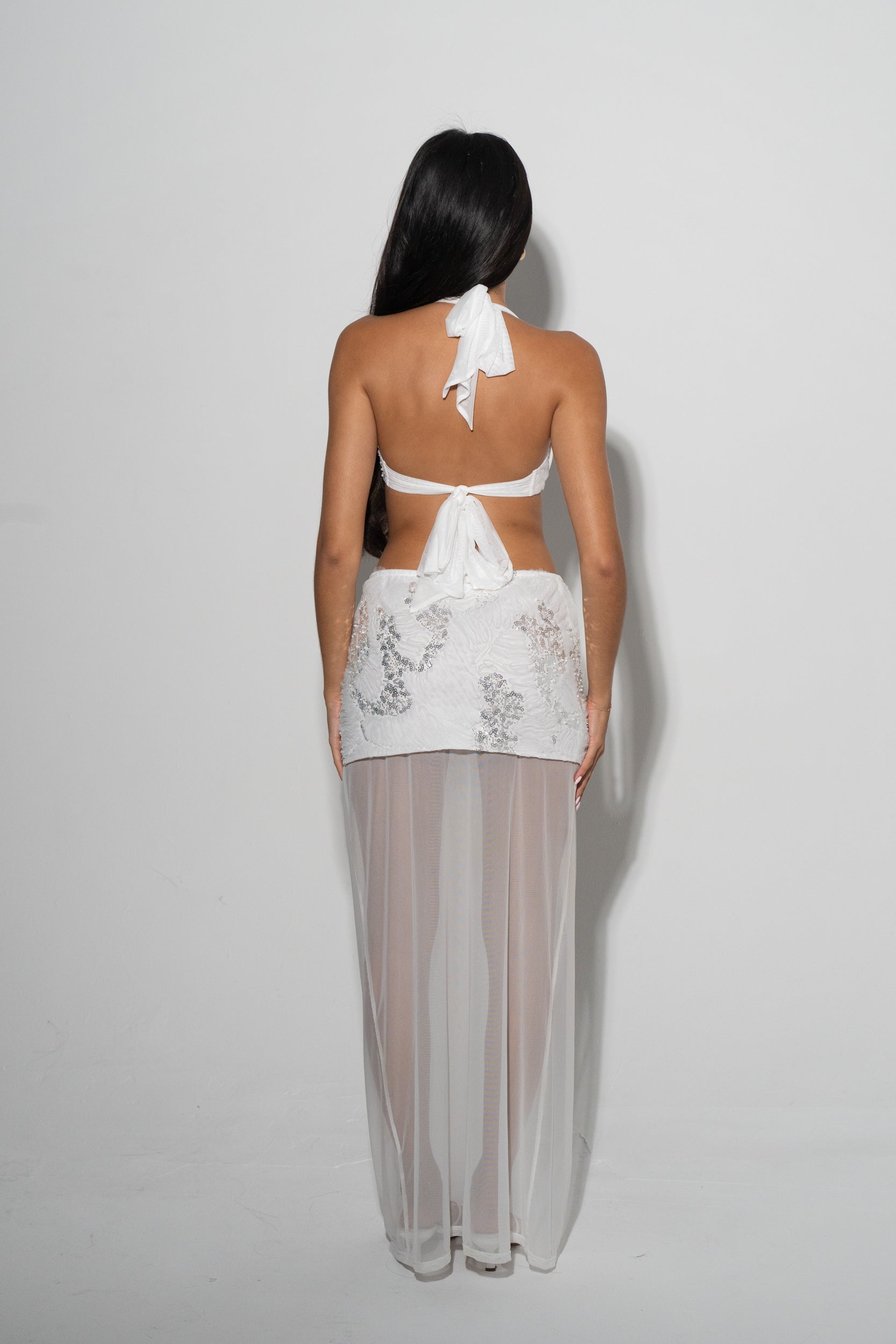 A heavenly maxi skirt with a beaded mini overlay and sheer mesh slit - the angel energy your wardrobe needs.