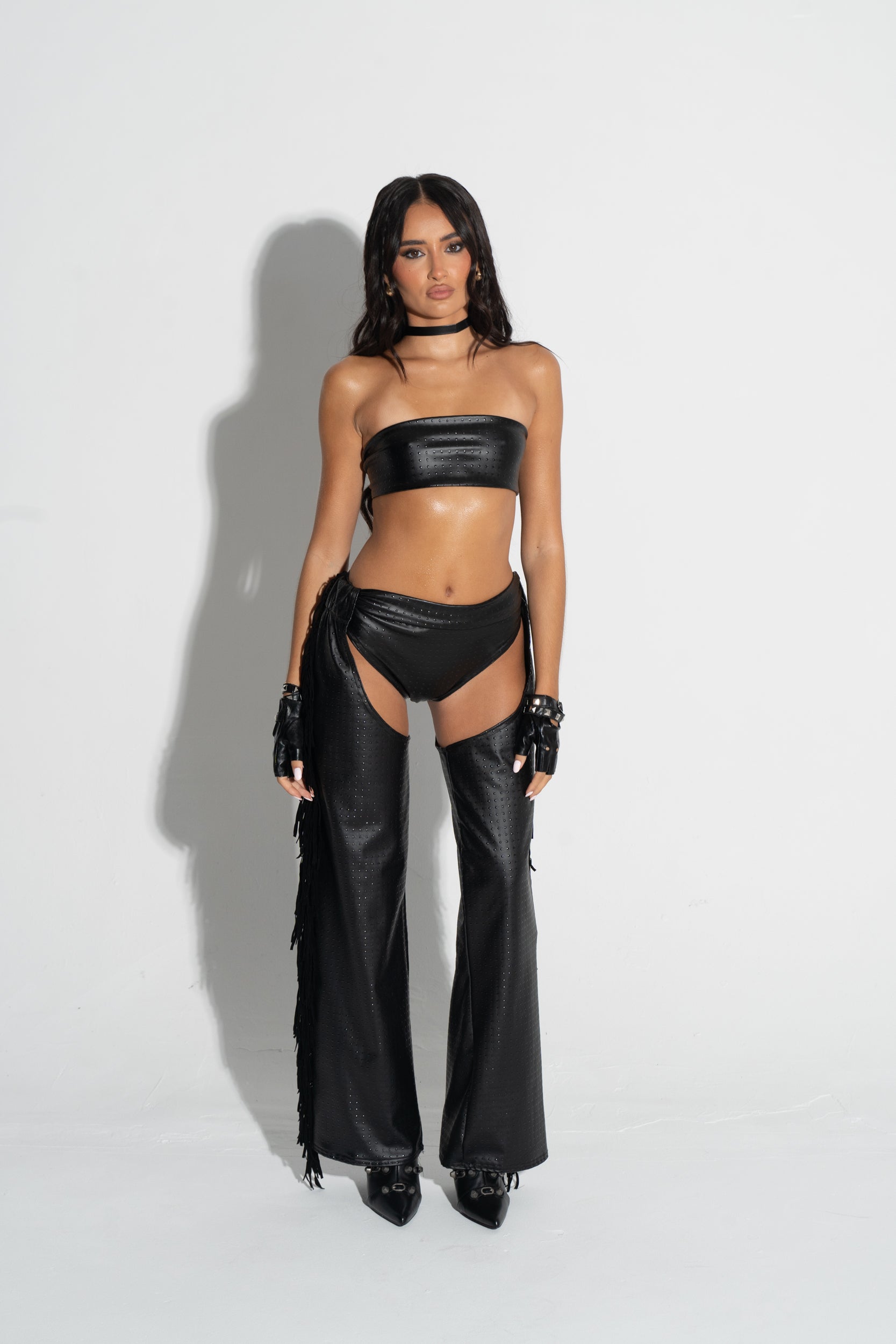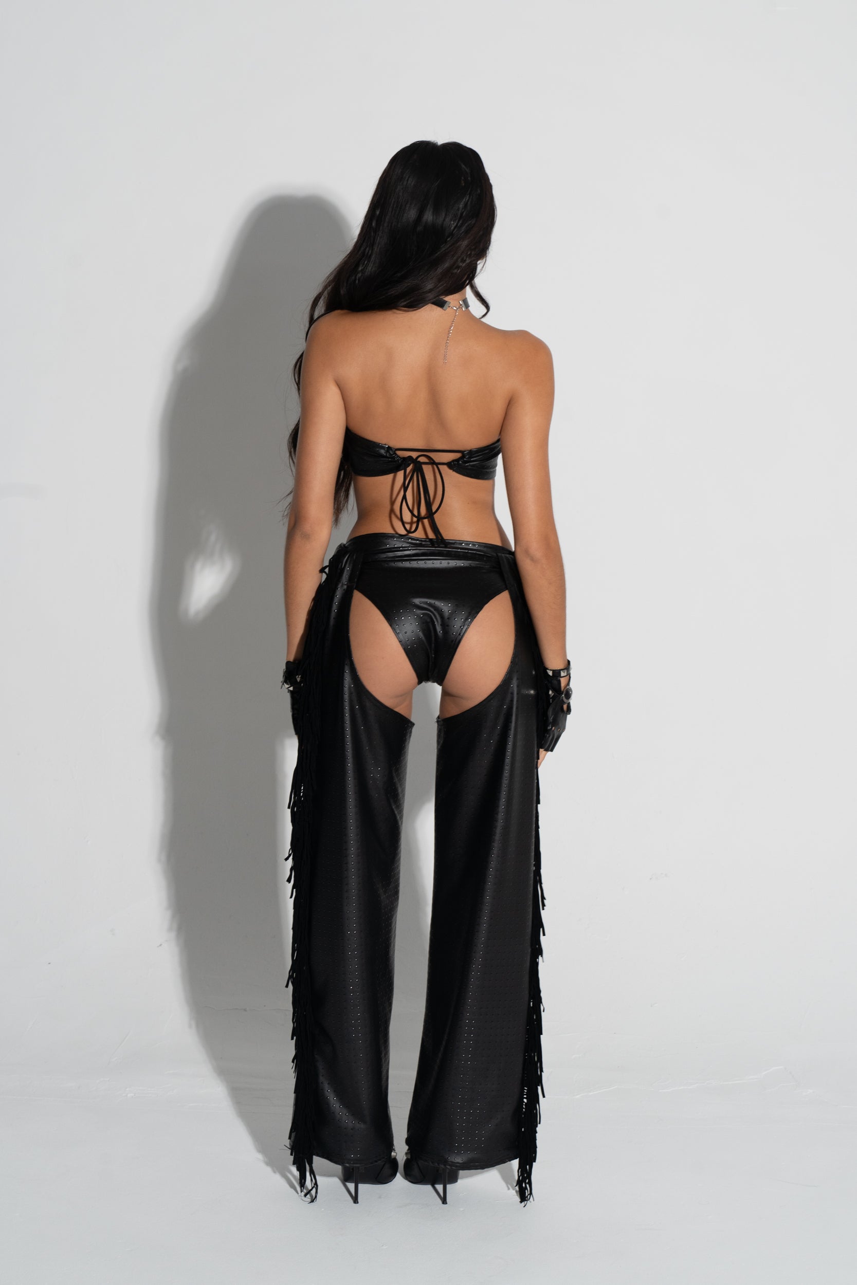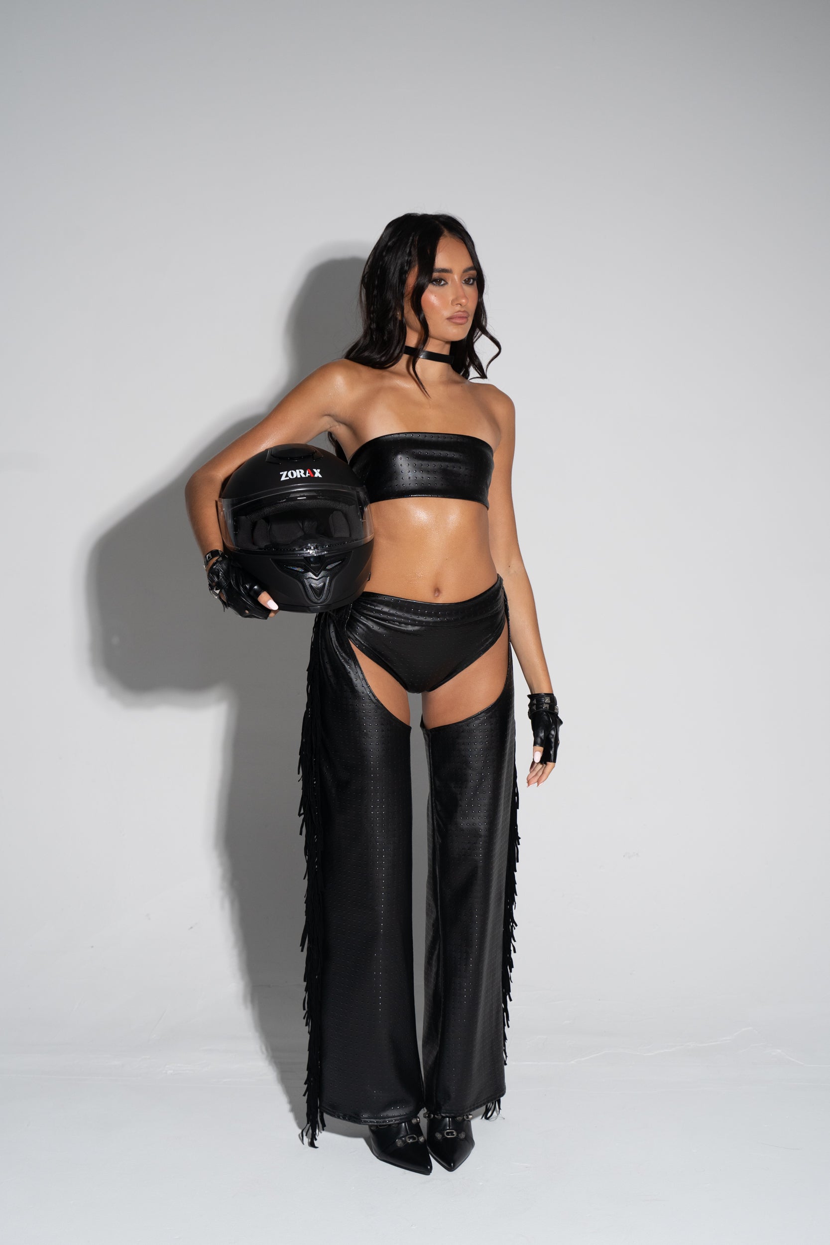 The ultimate statement piece ⚡️ These faux leather chaps come with faux suede fringing down the sides for maximum movement. Wear them over the matching bottoms or style with your own - either way, you’ll be serving pure biker babe energy. This is for the chaps only and the bottoms under are not included.